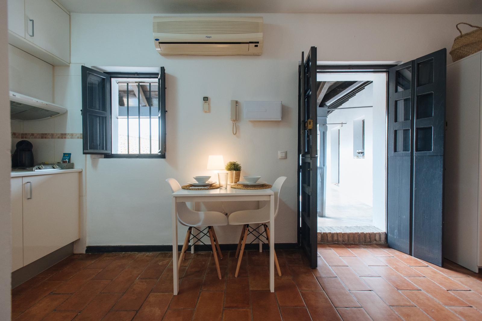 Estupendo estudio situado en segunda planta, soleado y con una confortable cama king-size, de 180 cm de ancho. Dispone de aire acondicionado frío/calor y un televisor de 30 pulgadas. Cuenta con una cocina americana completa, equipada con todo lo necesario (frigorífico, lavadora, placa, microondas, hervidor, tostadora, cafetera y todo tipo de utensilios) y un sencillo baño con ducha.