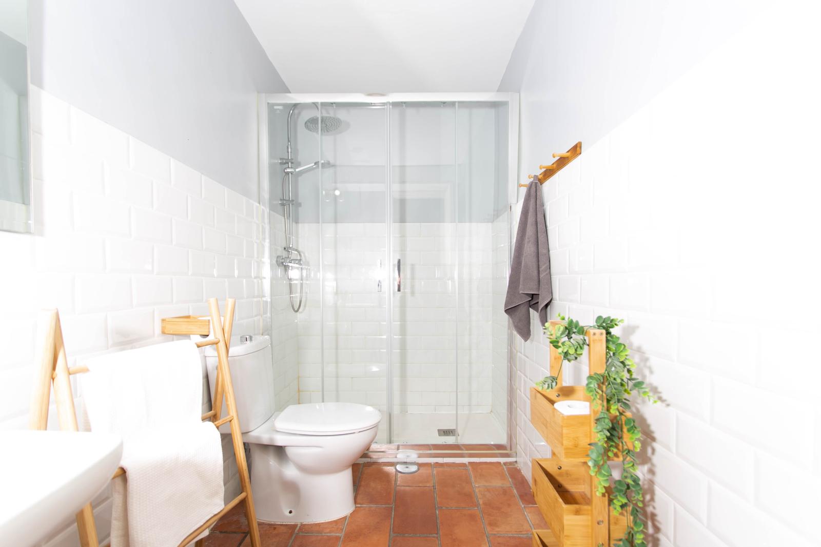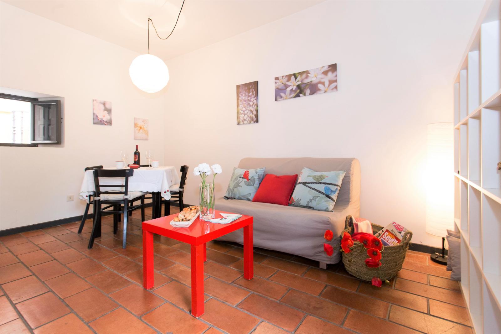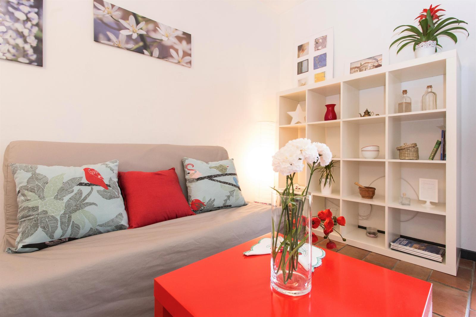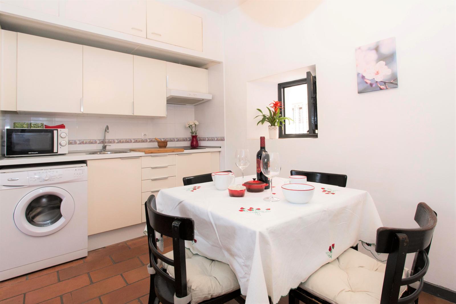 Sencillo apartamento de un dormitorio situado en la primera planta del edificio, con una zona de exterior en la terraza, con vistas a la fuente del gran patio/jardín central. Dispone de una cama doble en el dormitorio y de una mesa de trabajo en el mismo y un sofá cama en el salón, para acoger hasta cuatro personas. Está climatizado frío/calor y cuenta con un gran televisor de 43 pulgadas. Su cocina americana está completamente equipada con frigorífico, lavadora, placa, microondas, cafetera, tostadora, hervidor y todo tipo de utensilios para cocinar y una gran mesa redonda para comer. Su baño con ducha es amplio.