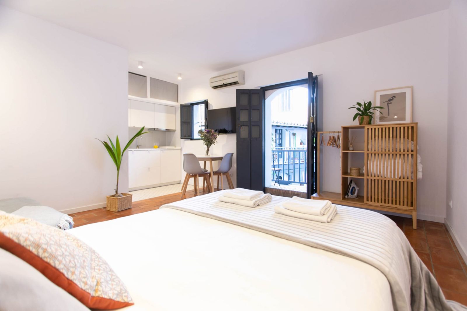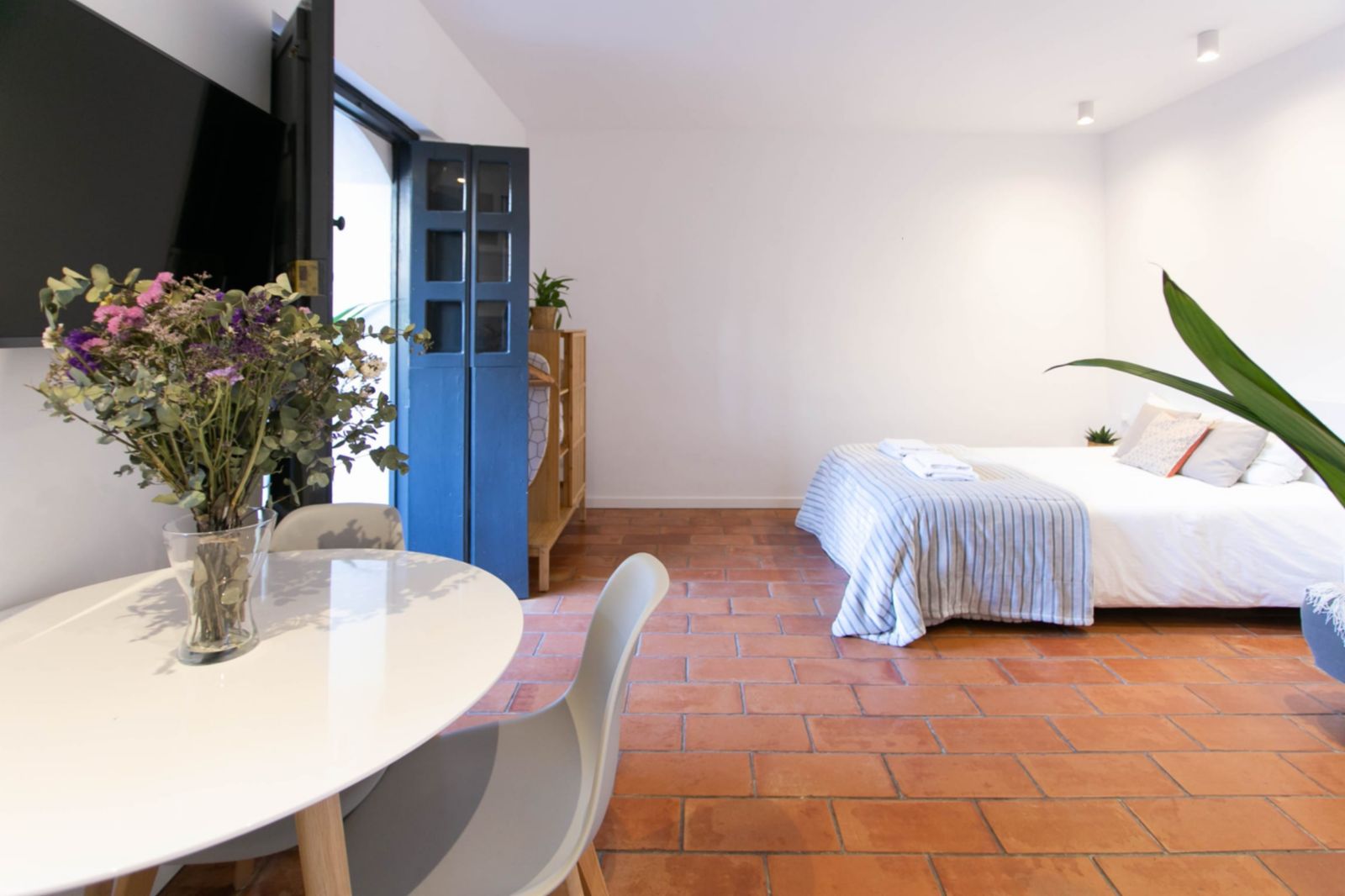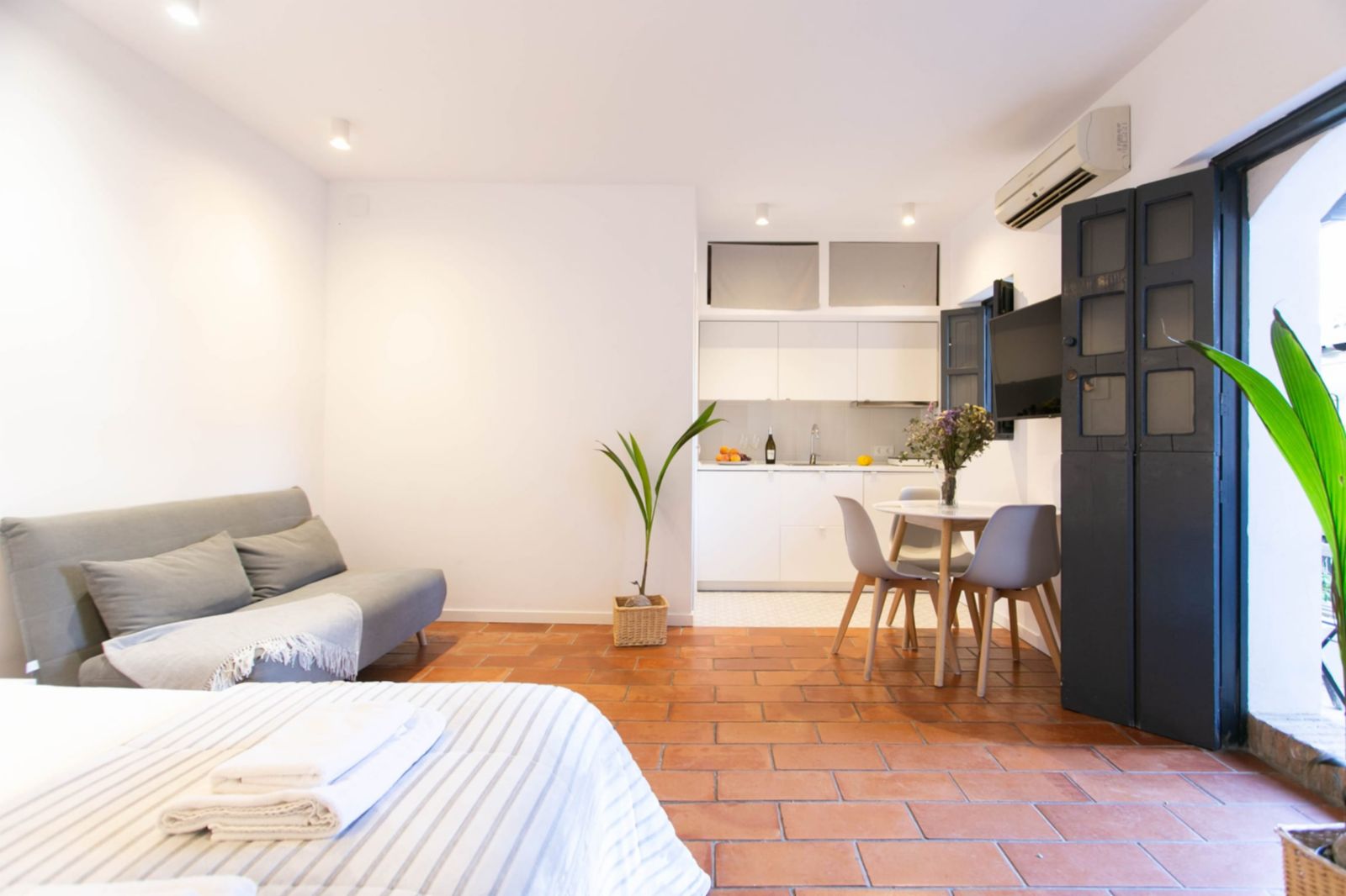 Coqueto estudio recién renovado en primera planta, soleado y con orientación sur, para disfrutar de su terraza a todas horas. Cuenta con una cocina americana completa, equipada con todo lo necesario (frigorífico, lavadora, placa, microondas, hervidor, tostadora, cafetera y todo tipo de utensilios), y una gran mesa redonda para comer. Dispone de una cama doble y un sofá cama apto para una tercera persona o dos niños, y un gran televisor de 43 pulgadas. Y está climatizado con frío/calor. Su baño con ducha es sencillo, despejado y accesible.