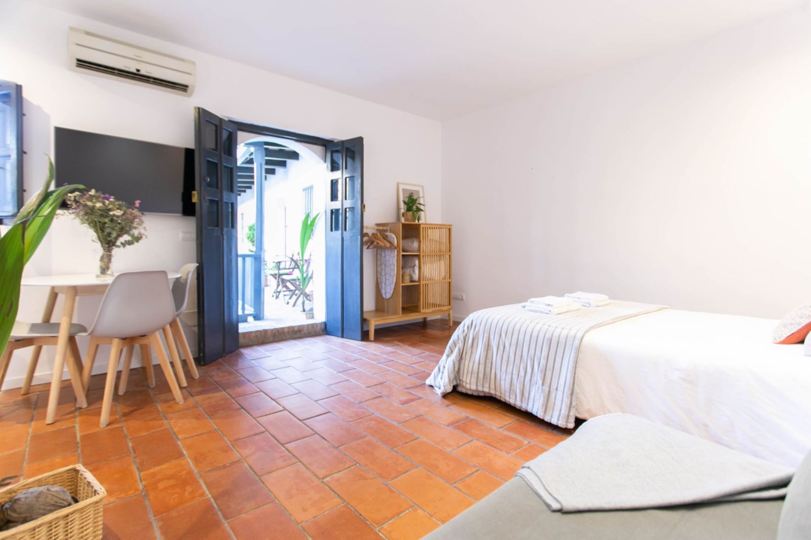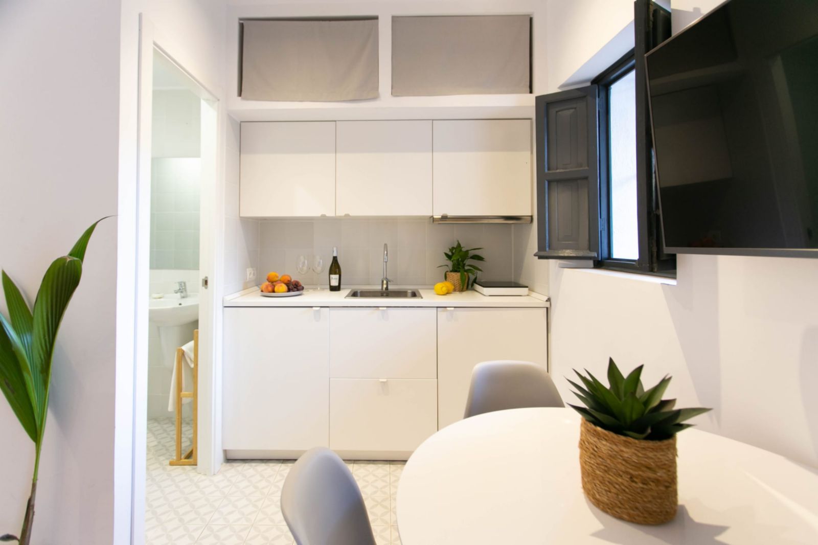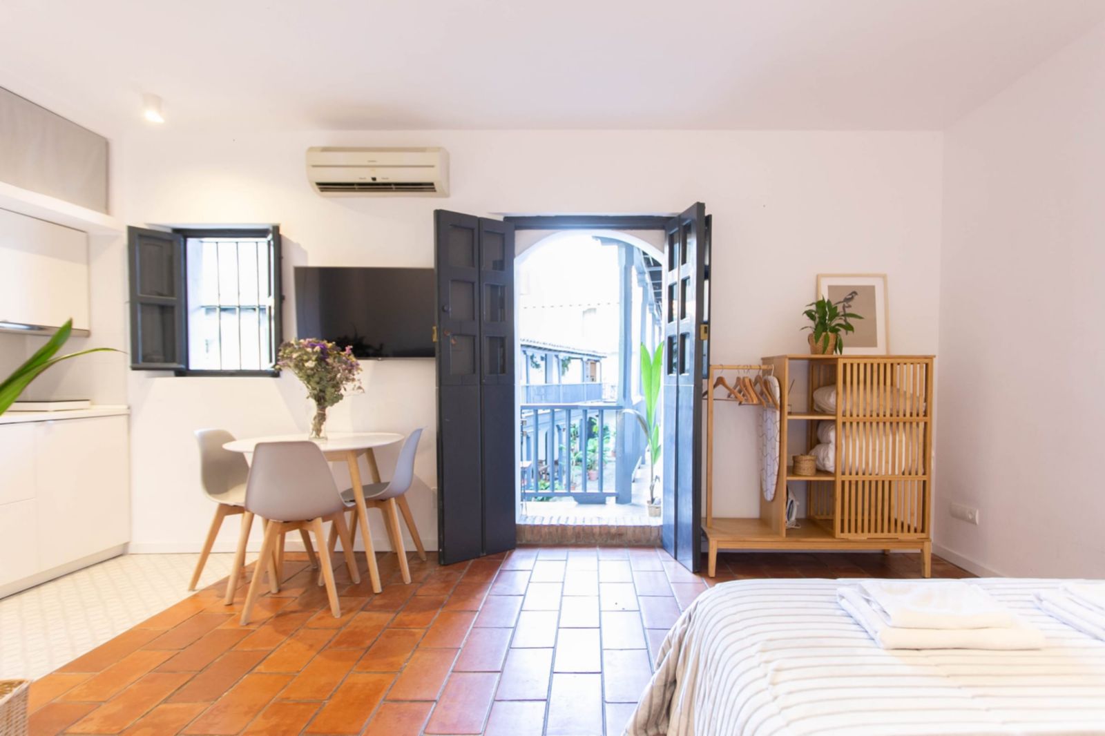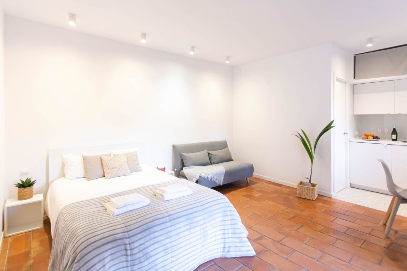 Coqueto estudio recién renovado en primera planta, soleado y con orientación sur, para disfrutar de su terraza a todas horas. Cuenta con una cocina americana completa, equipada con todo lo necesario (frigorífico, lavadora, placa, microondas, hervidor, tostadora, cafetera y todo tipo de utensilios), y una gran mesa redonda para comer. Dispone de una cama doble y un sofá cama apto para una tercera persona o dos niños, y un gran televisor de 43 pulgadas. Y está climatizado con frío/calor. Su baño con ducha es sencillo, despejado y accesible.